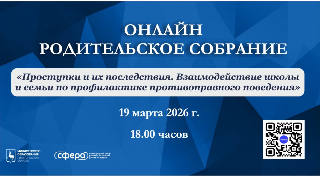 19 марта 2026 года в 18.00 в Нижегородской области состоится региональное родительское собрание в онлайн-формате на тему: «Проступки и их последствия. Взаимодействие школы и семьи по профилактике противоправного поведения». Мероприятие организует министерство образования Нижегородской области на базе нижегородского центра «Сфера».