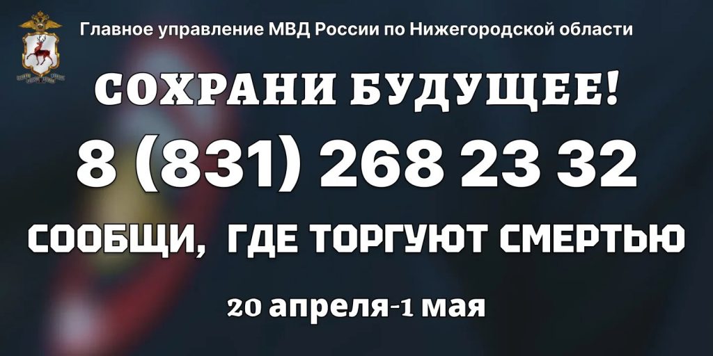 В Нижегородской области с 20 апреля по 1 мая 2026 года будет проходить первый этап общероссийской акции «Сообщи, где торгуют смертью». Цель акции — привлечение общественности к участию в противодействии незаконному обороту наркотиков, получение значимой информации, оказание квалифицированной помощи и консультаций по вопросам лечения и реабилитации наркозависимых лиц.
